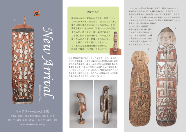 ユニークな彫刻が施されたニューギニアの楯や、
